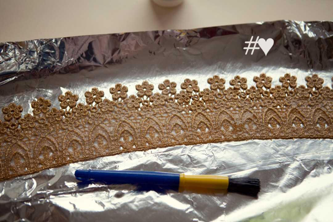 Place your cut lace onto your foil or other working surface and liberally coat with the fabric stiffener. Use your brush to work it right into all the holes. Turn over and make sure both sides are completely covered.